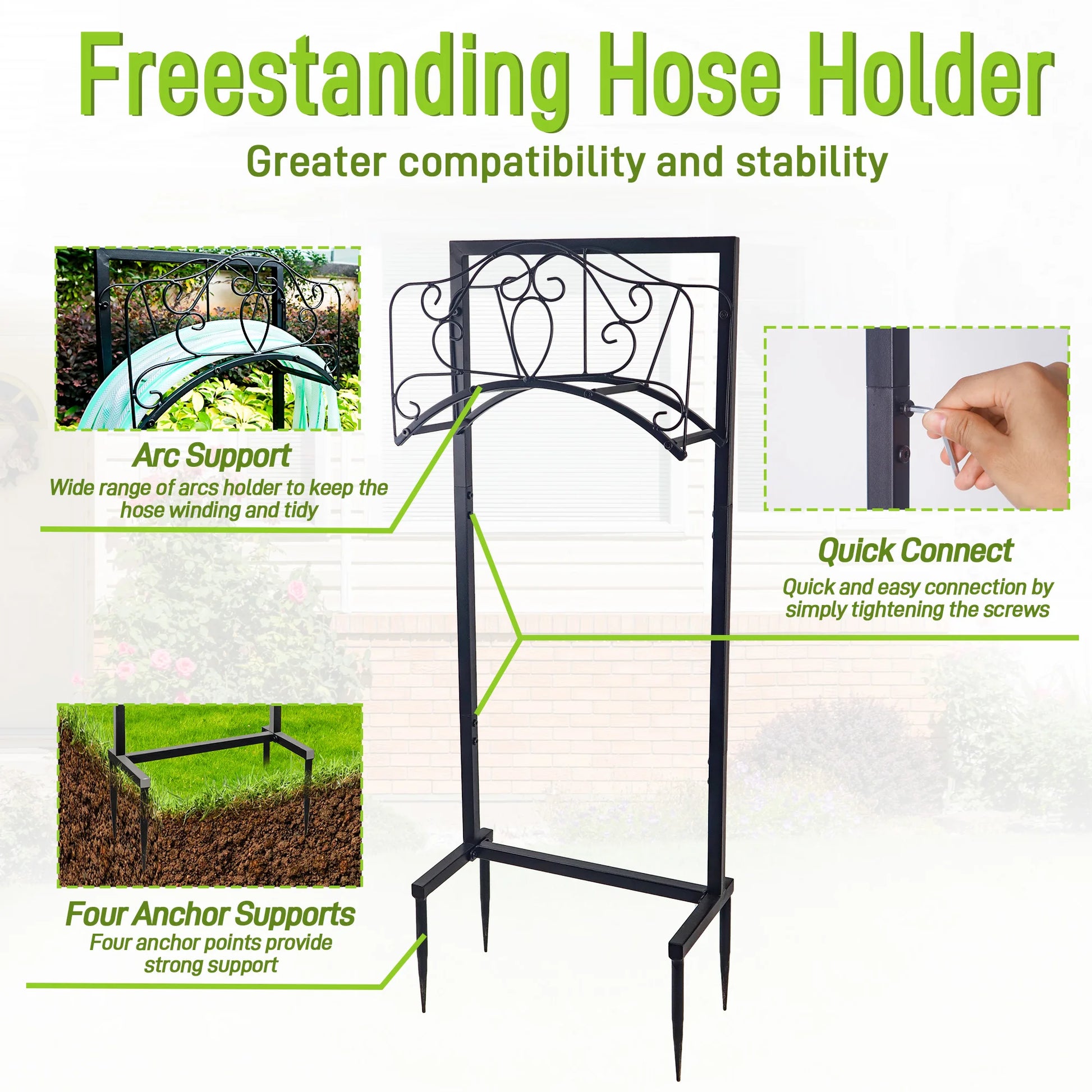 - 4 strengthened anchor points provide exceptional stability to support up to a 150 ft hose and resist bending.