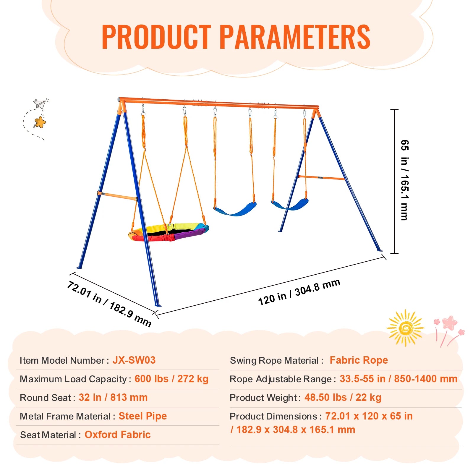 - Premium Oxford fabric seat resists wear and fading, while adjustable, sun-resistant PE ropes let you tailor swing height as your kids grow.